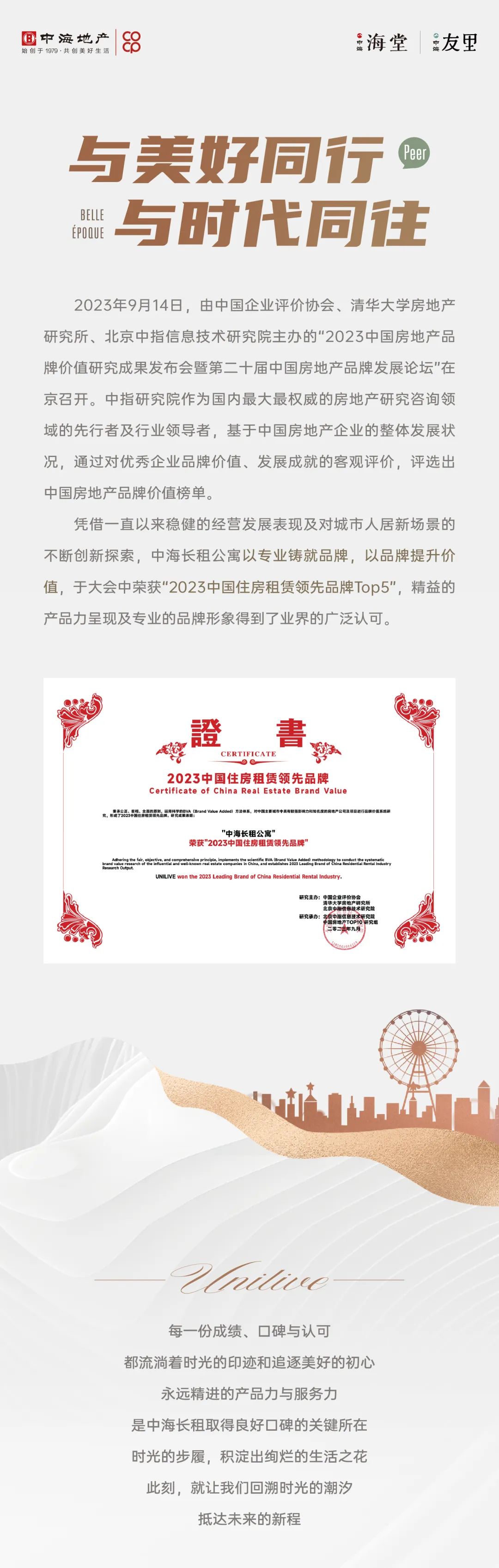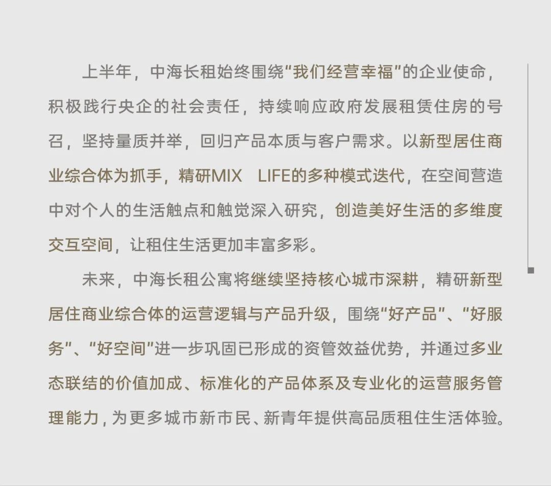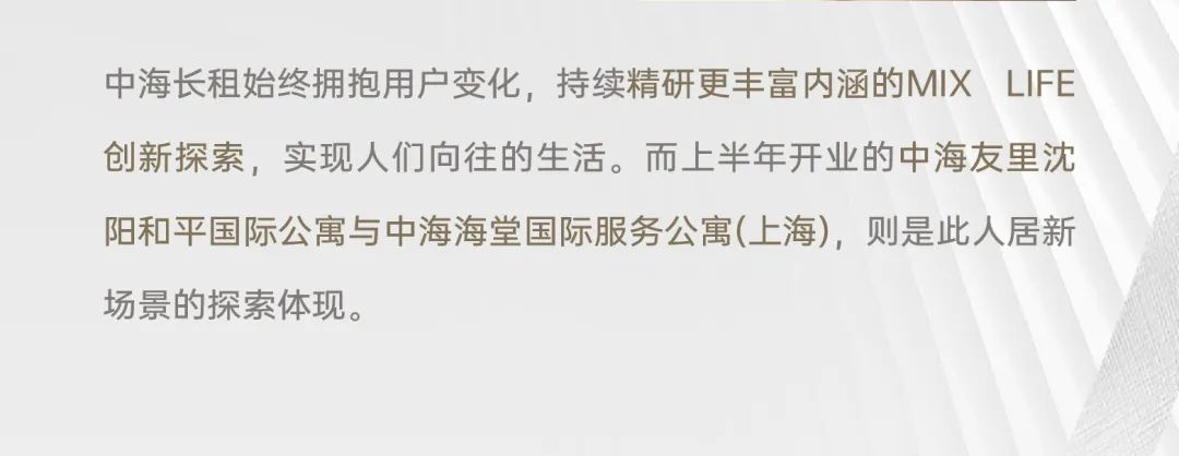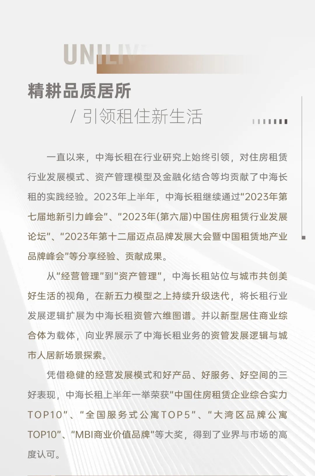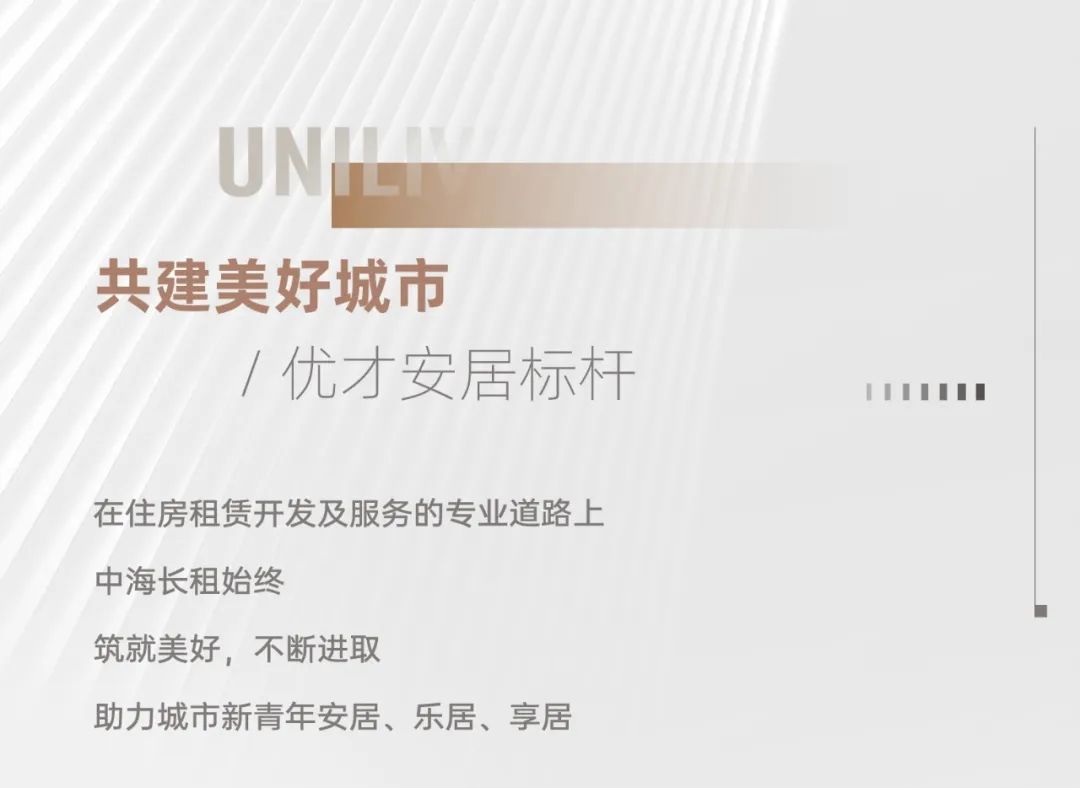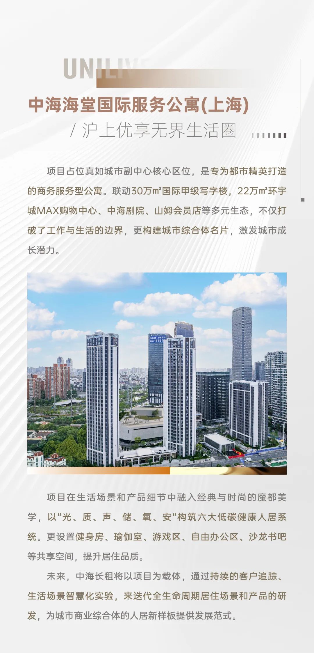 作为中海商业旗下的长租公寓运营平台,中海长租公寓构建了「中海海堂」、「中海友里」两大旗舰品牌,分别定位为商务服务型公寓及舒适社交型公寓,并且以“标准化服务、专业化管理及差异化产品打造能力”为核心,形成UROOM标准化管理服务体系,提供租赁住房全流程解决方案。截至目前,中海长租公寓「中海海堂」、「中海友里」已布局全国4大核心城市群、13大经济发展枢纽城市。依托中海商业全域商业价值链的业务循环,中海长租公寓将持续以优质的空间营造能力、专业的标准化管理服务,打造高品质的人居体验及高粘性的社群场景,实现真正的无界生活圈,以好产品、好服务构建美好生活空间。
