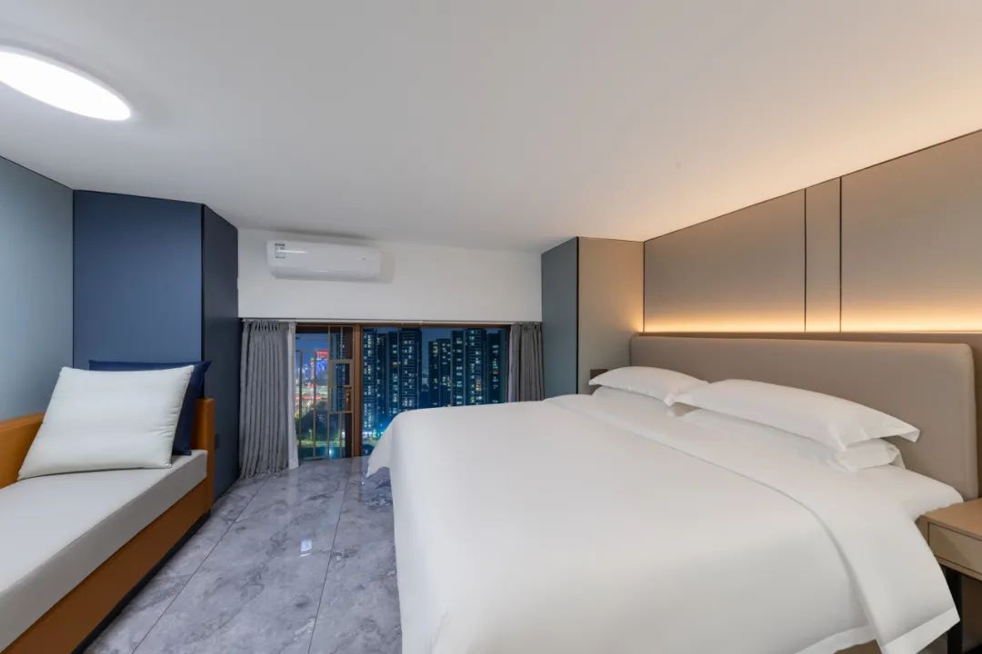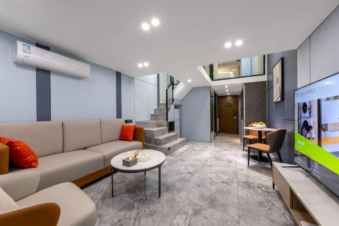 铂顿国际公寓茂名高铁站店所有客房均是拥有2个独立房间的套房,中空LOFT的设计空间感超赞。75寸大电视可供随时便捷观影,智能语音控制让旅客安坐客厅沙发也可控制窗帘、灯光等设备。