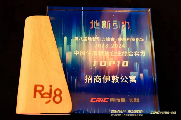 2024年5月28-29日,由克而瑞主办,中国房地产业协会指导的“第八届地新引力峰会 · 住房租赁论坛”在上海隆重召开。本届地新引力峰会邀请众多行业主流机构共同探索住房租赁市场的发展之路,并从多维角度分析住房租赁企业及市场,颁布2023-2024住房租赁企业研究奖项。其中,招商蛇口旗下招商伊敦凭借优秀的管理实力、产品实力、品牌实力获得“2023-2024中国住房租赁企业综合实力TOP10”表彰,这也是招商伊敦公寓第二次获得该荣誉,体现了行业主流研究机构、市场及客户的高度认可。