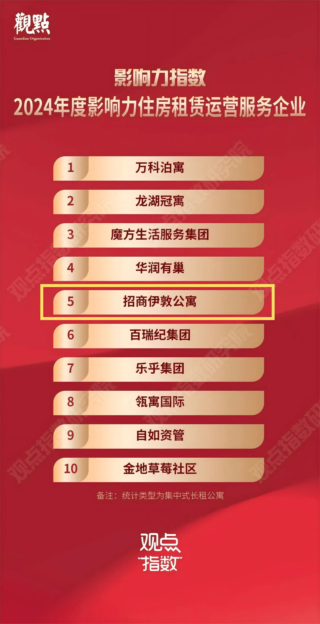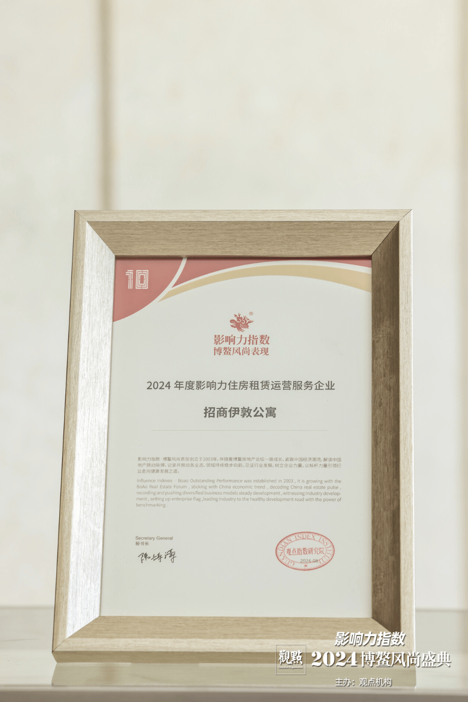 2024年8月13日-16日,由观点机构主办的2024博鳌房地产论坛及系列活动在海南举行,论坛发布“2024年度影响力住房租赁运营服务企业”榜单,招商伊敦公寓蝉联五强,获得表彰。