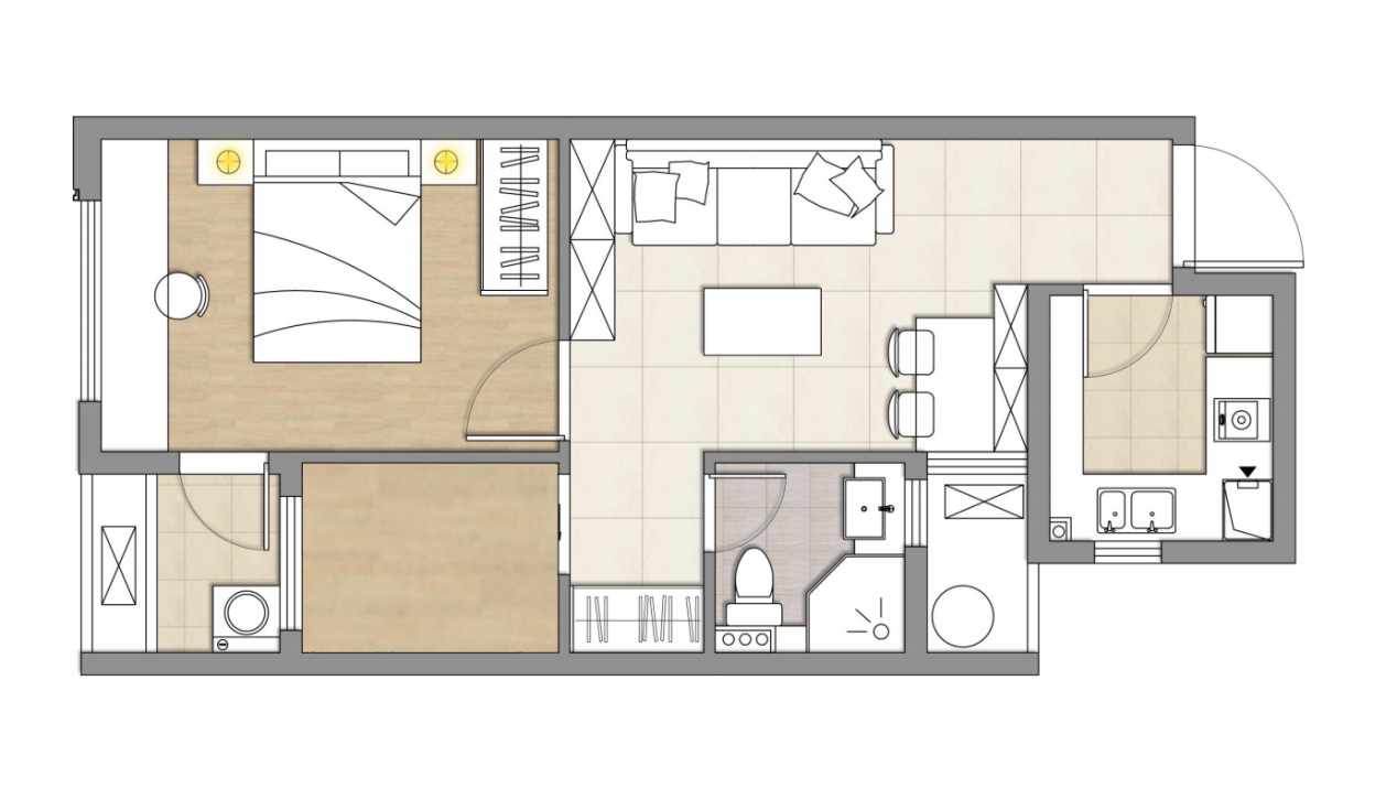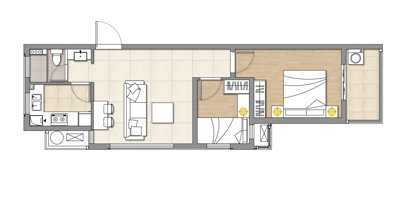 2.B户型:建筑面积约57㎡,一室一书房一厅一厨一卫