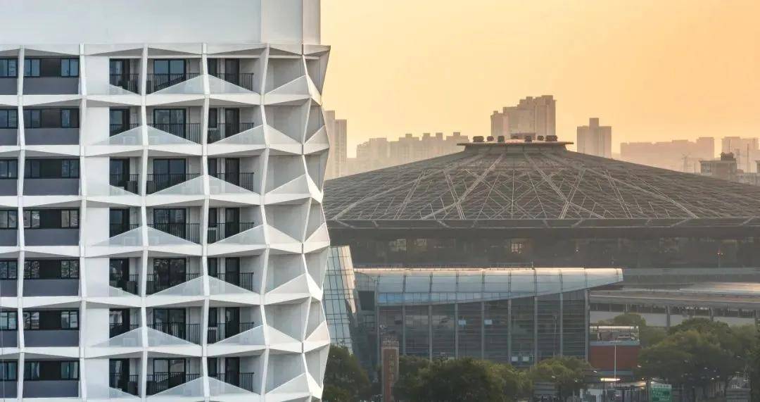 主立面布置,采用标准化单元构件的组合方式,提取多边形排列方式和几何形状,采用现代简洁的设计手法与灰度色彩,形成简约大气的自身建筑特质,具有很高的辨识度。