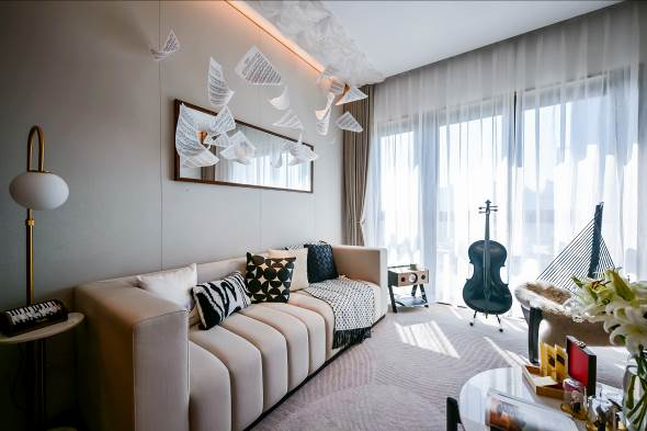 客房体验更显匠心独运:"梦响乐章"主题套房携手上海交响乐团晚高峰音乐会(Rush Hour Concert)品牌,以上海交响乐团文创、悬浮乐谱装置、La Boite Concept音箱与陈列式大提琴构建声光叙事。定期推送的"音乐菜单"与导赏沙龙,让住客在北外滩居所中聆听世界顶级乐章,实现艺术生活的无缝衔接。