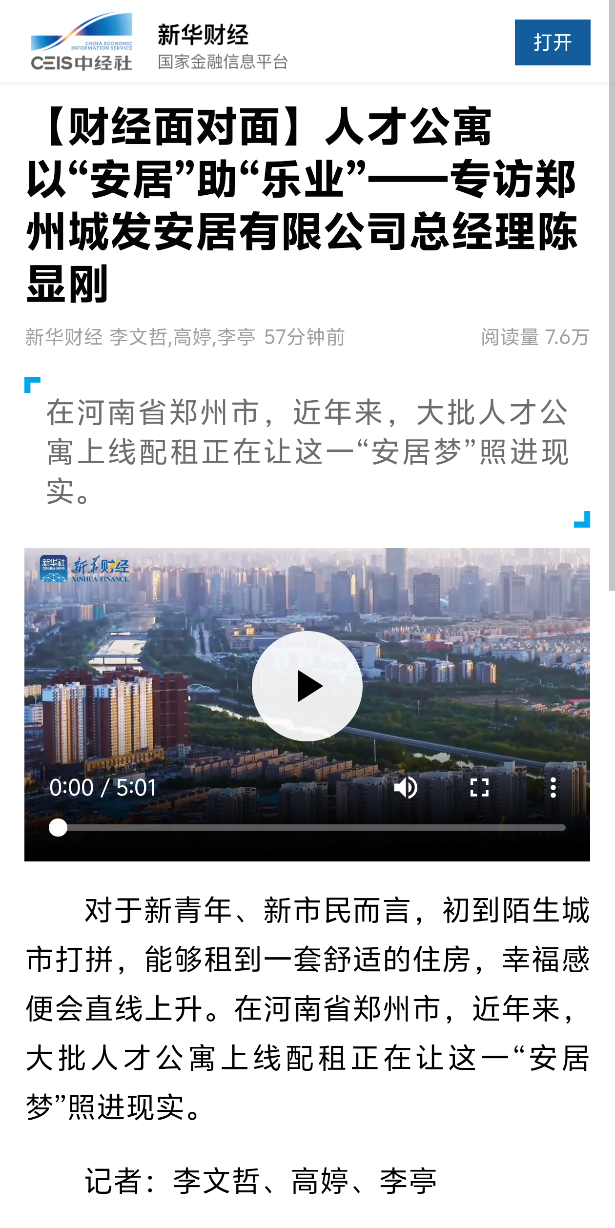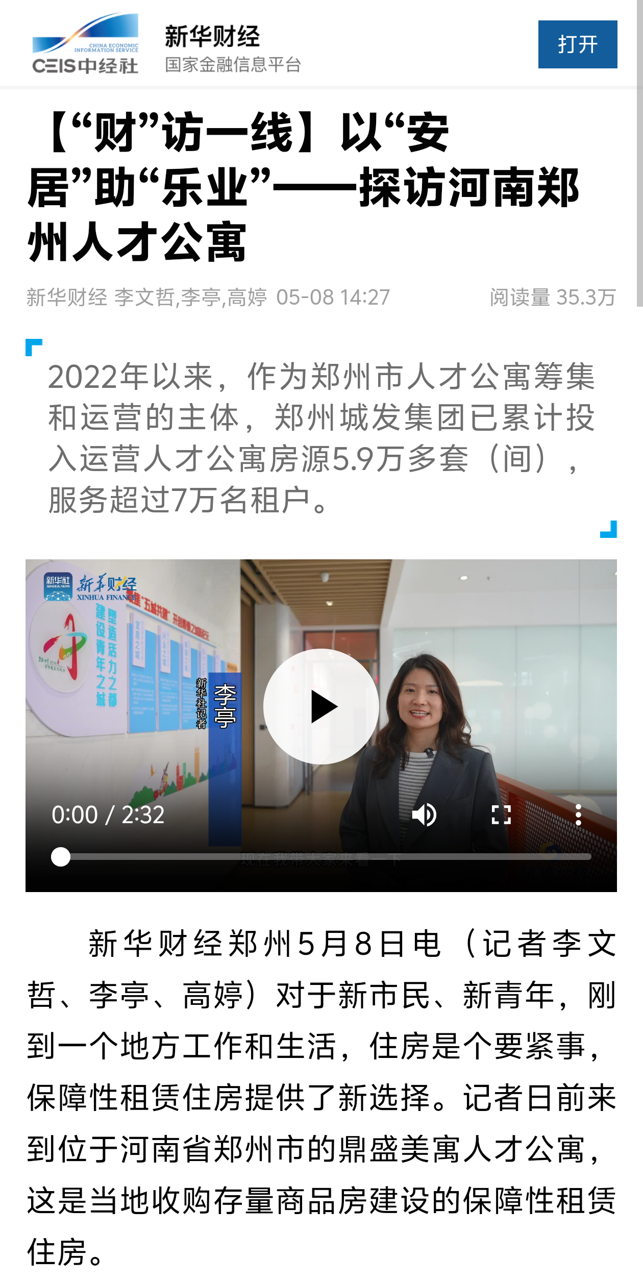 《新华财经》专访郑州人才公寓 以“安居”助“乐业”