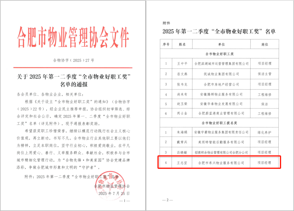 7月底,合肥市物业管理协会第七届理事会第三次常务理事会暨第七次会长办公会顺利召开。会议公布了2025年一、二季度“全市物业好职工”评选结果及“合肥市快递骑手友好示范小区”评选结果,合肥安居集团旗下合肥承兴物业管理有限公司获得多项荣誉。