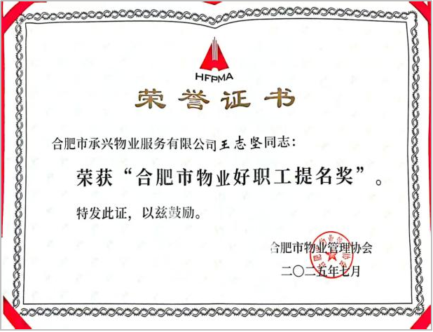 在此次评选中,承兴物业员工王志坚凭借出色的工作表现和专业的服务精神,荣获了“全市物业好职工”提名奖。