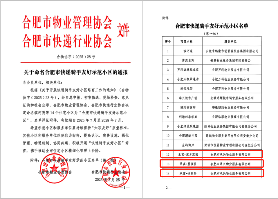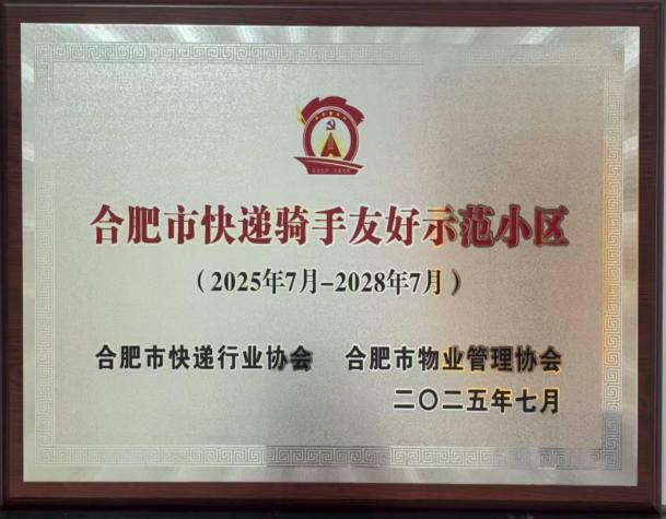 与此同时,承兴物业所管理的承寓・东方家园店、承寓・星澜里及承寓・悦然居三个小区荣获 “合肥市快递骑手友好示范小区” 授牌表彰,这一荣誉的背后,是公司对快递骑手群体的贴心关怀与周到服务。为了给快递骑手提供便利,小区内设置了专门的快递存放点、休息区,还配备了充电设备等物资,让快递骑手在忙碌工作中能感受到家一般的温暖。这种人性化的服务举措,不仅提升了项目服务品质,也为城市的快递行业发展贡献了一份力量。