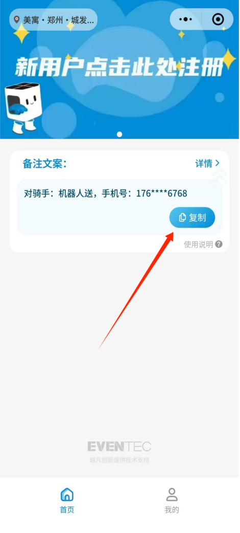 第一步:扫描现场宣传海报二维码或微信搜索“享递机器人GO”小程序,点击注册区域