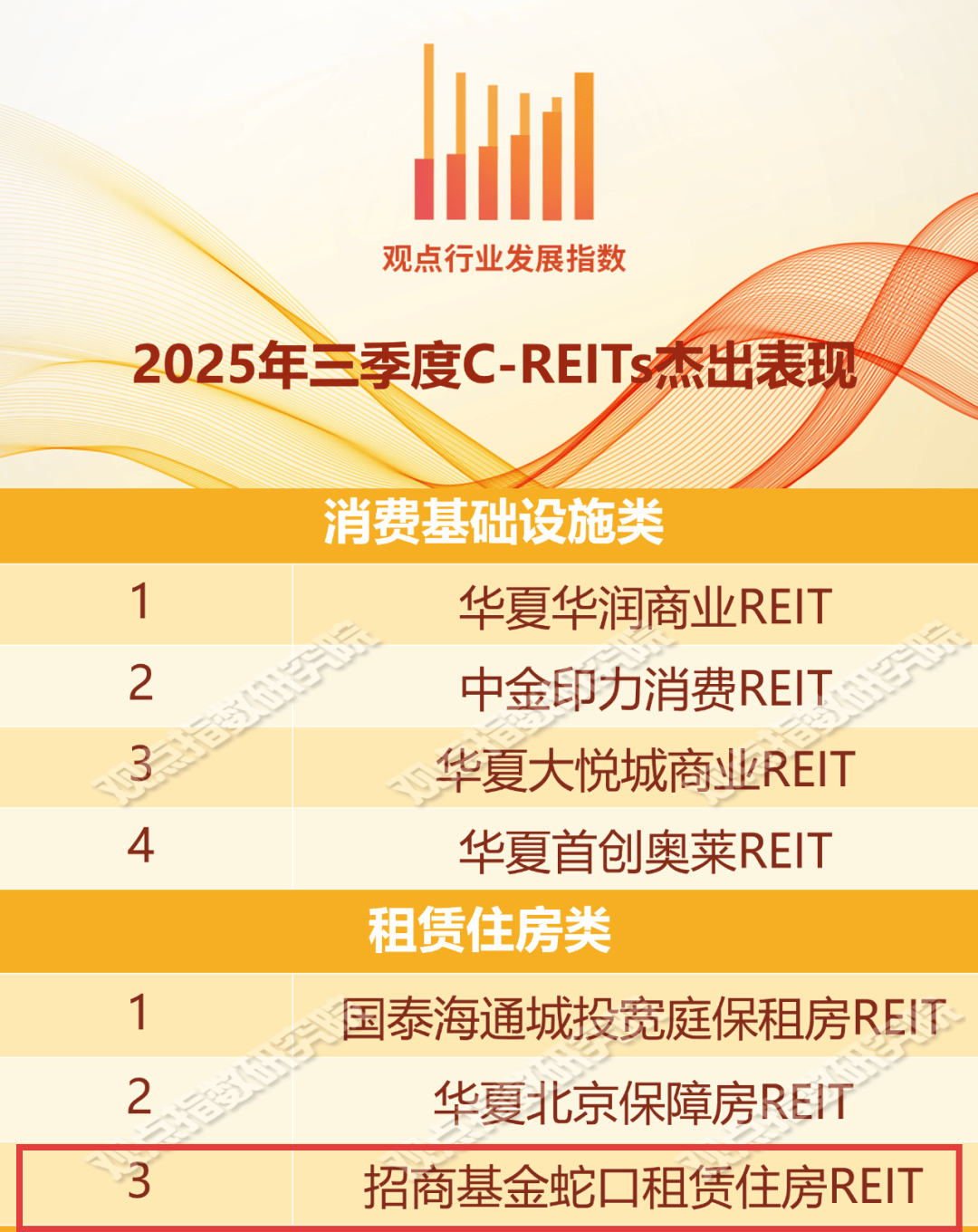 9月28日,观点指数研究院发布《2025年三季度REITs发展报告》,招商基金蛇口租赁住房REIT荣获“观点行业发展指数2025年三季度C-REITS杰出表现(住房租赁类)”TOP3。