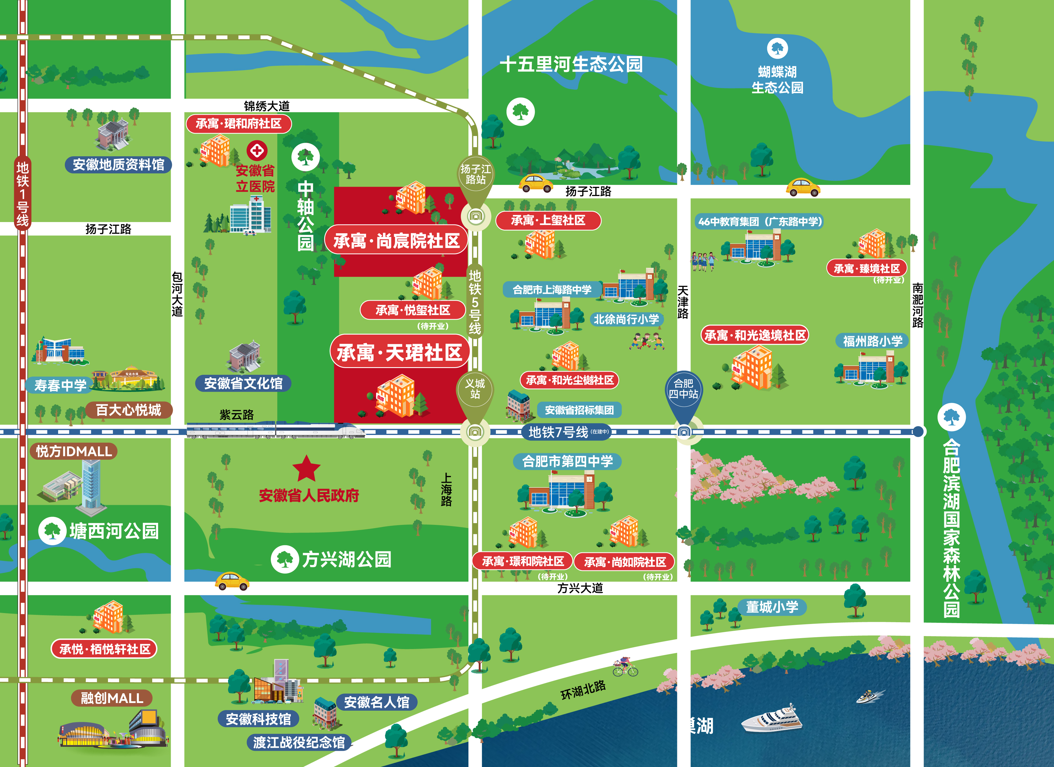 承寓·尚宸院社区近邻地铁5号线扬子江路站,步行5分钟上车,即达包河、庐阳主城区,通勤党直接实现“懒觉自由”。周边悦方ID MALL、百大心悦城等商圈近在咫尺,周末休闲不绕远路,生活便利度拉满。