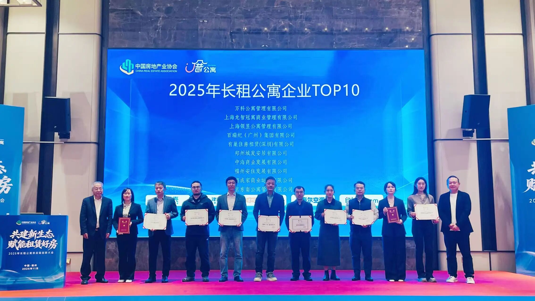 今日,在福州召开的“共建新生态·赋能租赁好房”2025年长租公寓供应链创新大会上,公寓公司凭借稳健且优异的表现,荣膺“2025长租公寓企业TOP10”称号,并同时获评“2025长租公寓指数参编企业TOP20”荣誉,首次进入由中国房地产业协会颁发的全国范围的行业头部榜单。