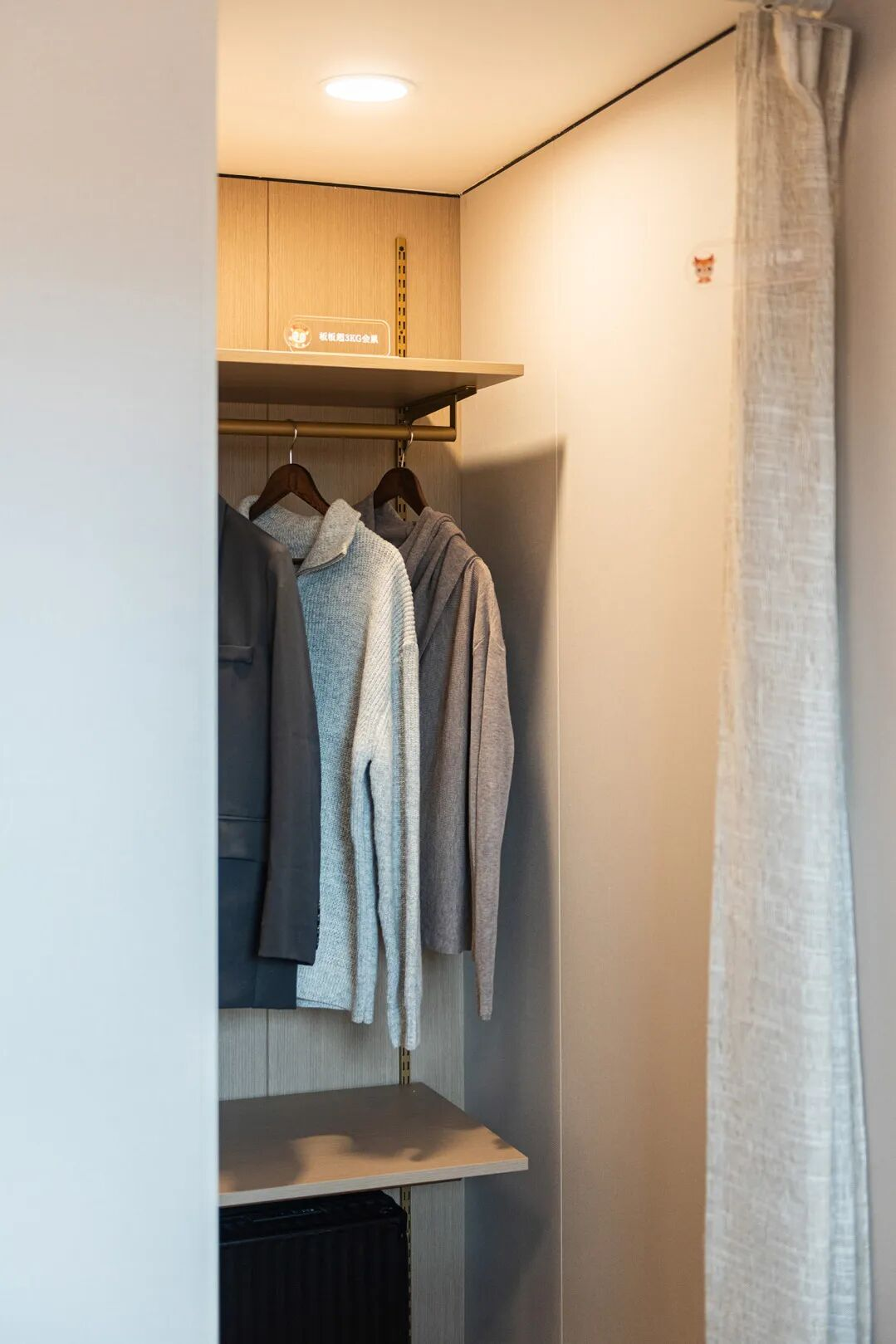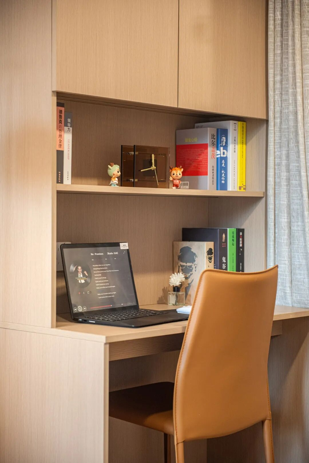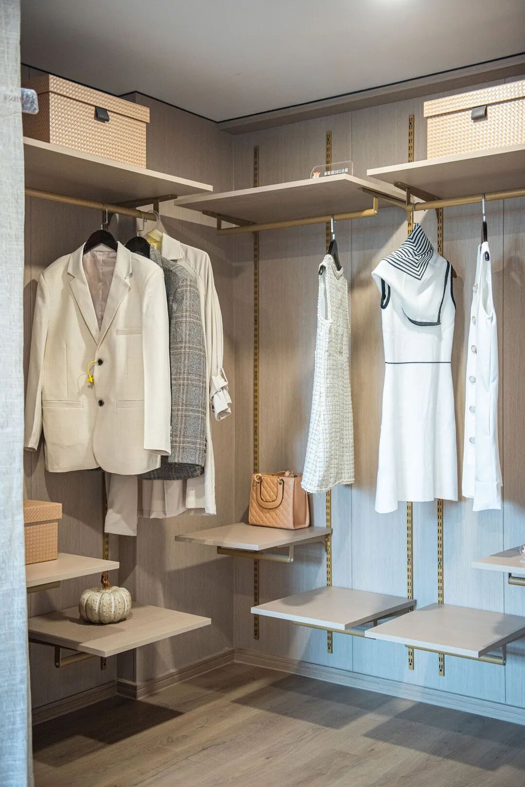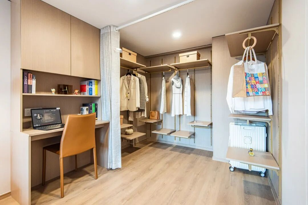 如果说开放式户型的步入式衣帽间,与卫生间实现了联动,那么间隔式户型的衣帽间,则设在卧室一侧,与写字台形成“帘动”。两者相同之处,在于都采用时尚简洁模式:错落承重板+空间自由布局,给予租户更多个性化调配可能。