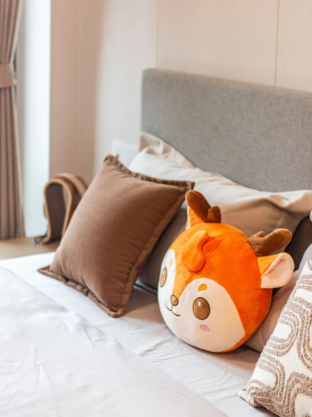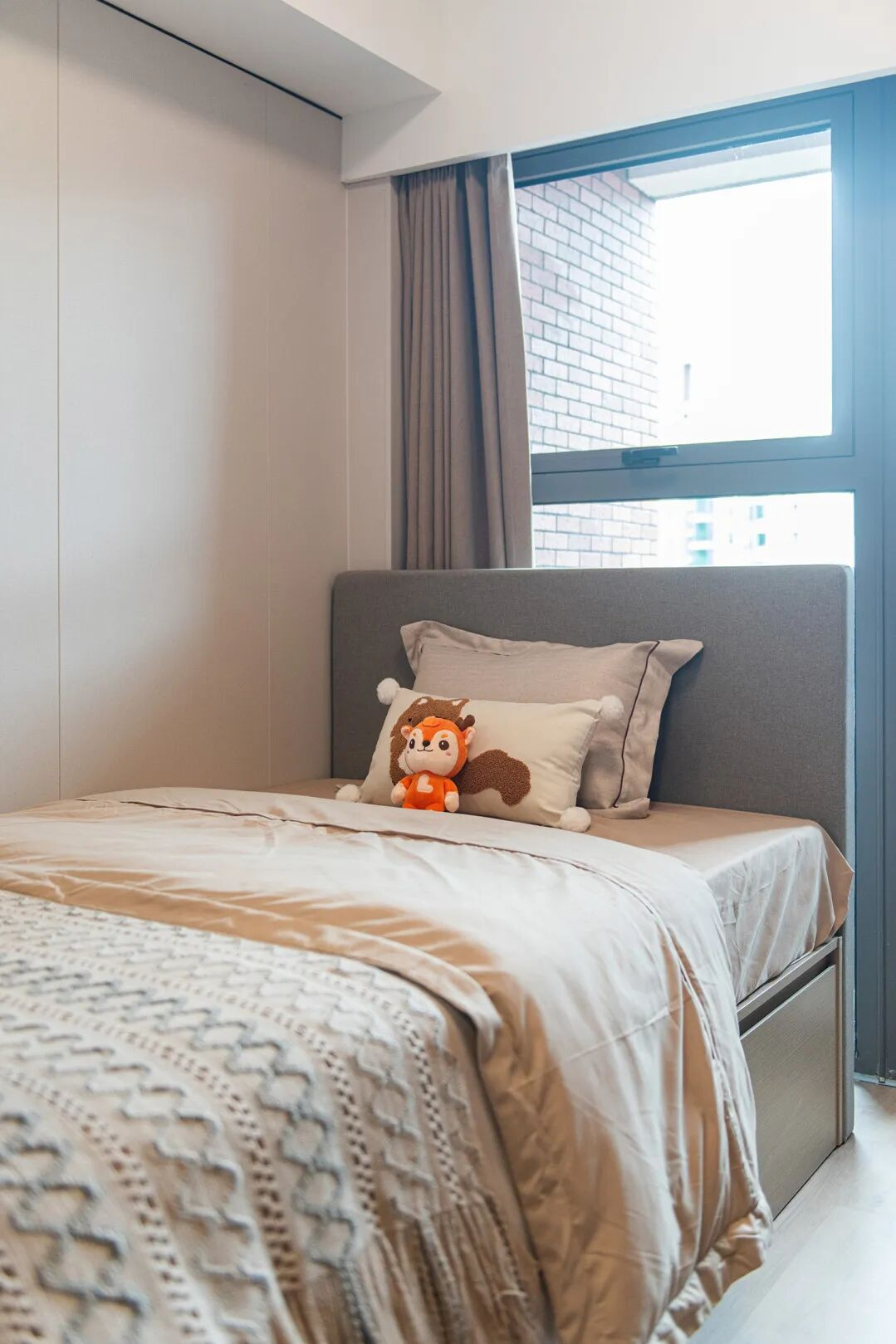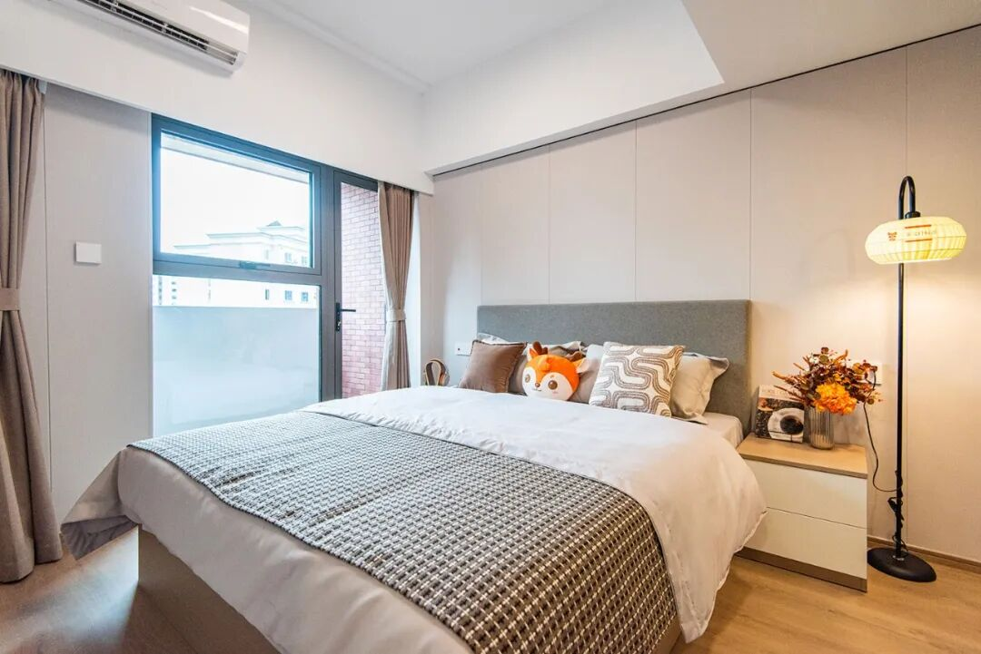 整体色调同样采用低饱和度的奶咖色,联通式户型打破卧室与客餐厅的分界,两扇落地窗+两个户外阳台的设计,令尺度与采光更加出色。如果想要卧室区更私密一些,顶部早已预留了滑轨位置,方便租户安装隔断帘。此外,原先1.35×2米的床垫,此次焕新后,全线升级成了1.8×2米,尺度感更优越!