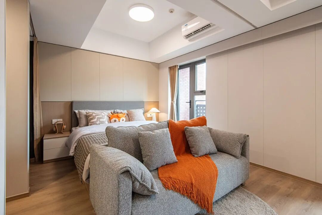 横抛在床尾的沙发,不仅成为卧室与客厅的过渡,也是慵懒休憩的智选。说到这里,还暗藏了一个细节:原先选定的沙发,长1.8米。在居住考察体验中,陆家嘴乐居团队发现,躺在沙发上,如果腿伸不直,舒适感会大打折扣,于是当机立断全部改换成2米长的沙发,以期让租户实现“躺平”模式。这一改变,妥妥码住了服务细节。