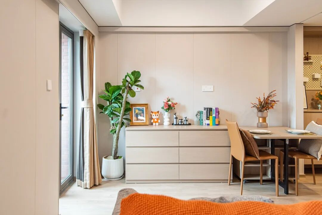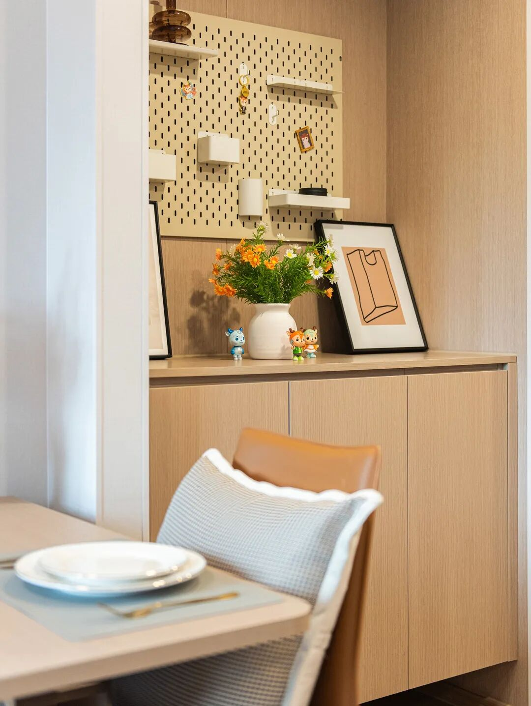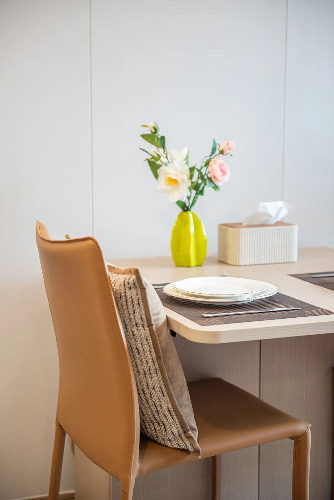 如果有亲朋来访,除了沙发可小坐,餐桌也能从日常的两人位,轻松变身成四五人用餐都不会觉得拥挤的大桌。几把靠背椅更实现了“叠叠乐”功能,收纳不占地儿,摆开来又能轻松切换成聚会模式。