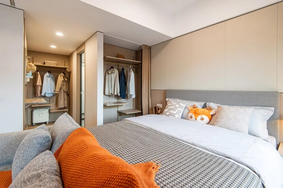 公寓除约50㎡户型外,另设有部分约25㎡户型。房内配1.1×2米定制床,软硬适中且床底藏储物空间,二合一书桌餐台,洞洞板与展示架营造松弛感。床尾通顶橱柜加拉帘,物品各归其位,都市生活超丝滑。