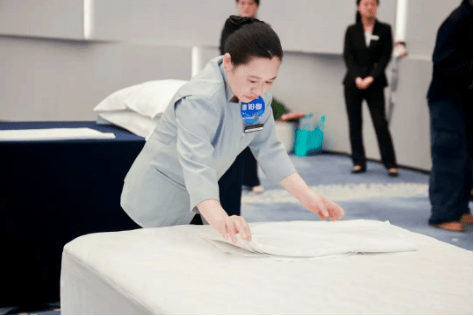 选手们以精湛的手艺和创意的设计,将中式铺床实操、欢迎礼展示等环节演绎得淋漓尽致