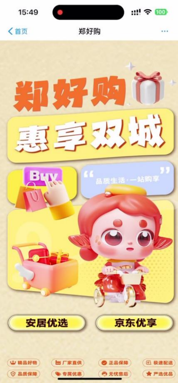 进入“郑好购”页面授权登录后,选择你想逛的板块(安居优选/京东优选)