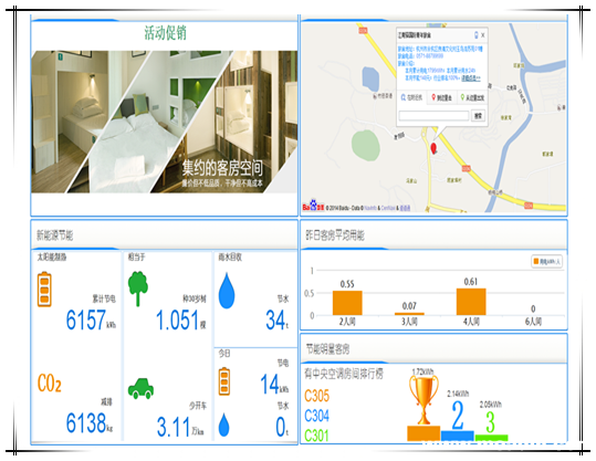 1、在大堂内放置液晶显示屏,记录旅舍的绿色节能信息,实时显示从运营至今已经节约了多少能源,相当于种了多少棵树,少开多少次车。同时,根据客人入住客房能耗的多少评选出当次的节能明星客房;