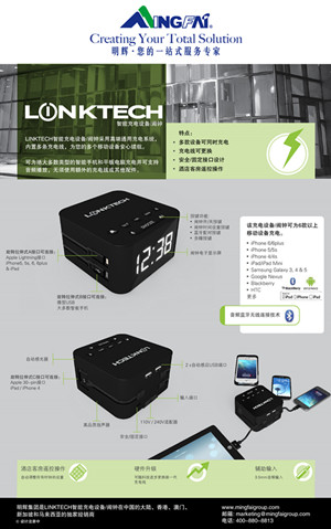 明辉集团重磅推出酒店客房“LINKTECH智能充电设备/闹钟”,为亚太区酒店客户打造一款提升便捷体验的智能产品。