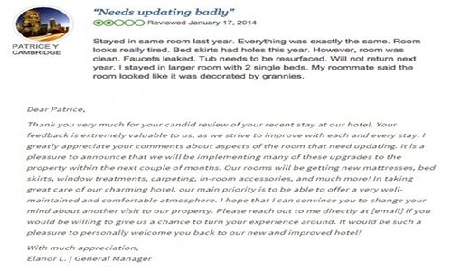 如今,社交媒体的出现以及酒店在线评论网站的普及使得酒店再也不能对各种声音置之不理。积极答复顾客的在线评论是至关重要的,这种做法能让顾客感觉到自己的意见被酒店倾听,同时也表达了酒店对客人入住满意度的重视。评论数量的增加也有助于酒店评分的上升,此外,酒店管理人员能够进一步跟顾客进行交流和意见分享,这也是顾客最初撰写评论的原因。