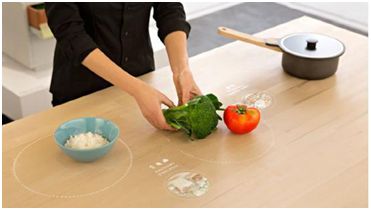 在概念厨房2025的最新设计中,宜家展示了全新的未来概念厨房,这个设计能帮助酒店节约不少的时间和资源,比如储藏室感应冷却系统(显示食品保存时间)和自动垃圾回收系统,同时还有一张非常智能的厨房操作台。这个操作台包括了拥有摄像头的投影仪,可以识别食物原料和成分,同时自动生成菜谱和重量。另外,在桌子下方还隐藏了磁感应炉,可以将烹饪工具直接放到桌面上就可以加热。