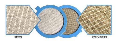 话说虽然Gbreeze“个头”不大,但是其内部过滤系统却很完善,共包含四层过滤层,分别是塑料网层、两层无纺布层和蜂窝活性炭层,所以能过滤掉大部分肮脏的颗粒。以下是过滤层使用前和使用2周后的样式对比,可以很明显看出区别:
