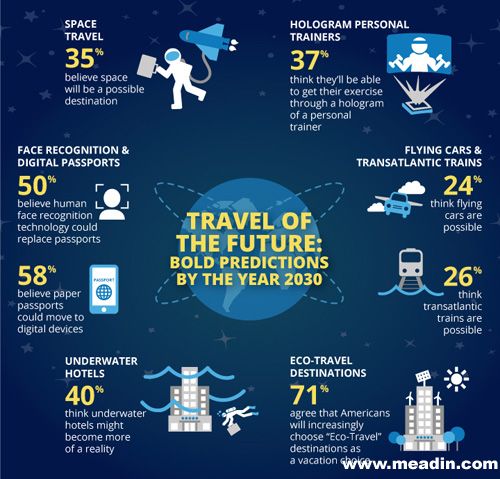 4. 太空目的地旅行:35%的旅客相信2030年去太空旅行不再只是空想。当然,这些旅客中男性所占比例比女性更大。