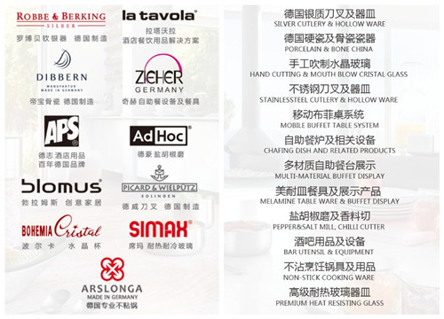上海永艺:上海永艺是一家成立了10多年、专注于酒店餐饮用品供应的公司,在2009年完成了重组注资后,公司向多品牌、多材质产品、解决方案提供商发展。目前代理了来自欧洲的十多个品牌,且都是细分行业的翘楚,在细分品类中更是独占鳌头的品牌。比如全世界都视为行业绝对领先者的银器品牌ROBBE&BERKING罗博贝钦,LUFTHANSA汉莎头等舱指定用德国德国骨瓷DIBBERN等等。目前产品包括了不锈钢刀叉和桌面用品,银质刀叉和桌面用品,自助餐炉和相关餐饮设备,酒吧用品,移动自助餐台,自助餐陈列和餐饮用具等12大类产品,能全面满足酒店餐饮的各项需求。同时,在德国汉堡有兄弟公司PEKINGSTONE负责解决欧洲一切的物流业务,因此我们获得了在物流时间和成本上的优势,服务效率和交货能力在众多进口公司中具备极强的竞争优势。我们代理的品牌和品类如下图所示: