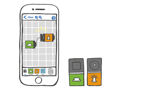 MESH的连接如同游戏般,比如按下按钮LED灯就会亮起,输入按钮标签的图标和LED标签的图标,这样就轻松地连接上了。