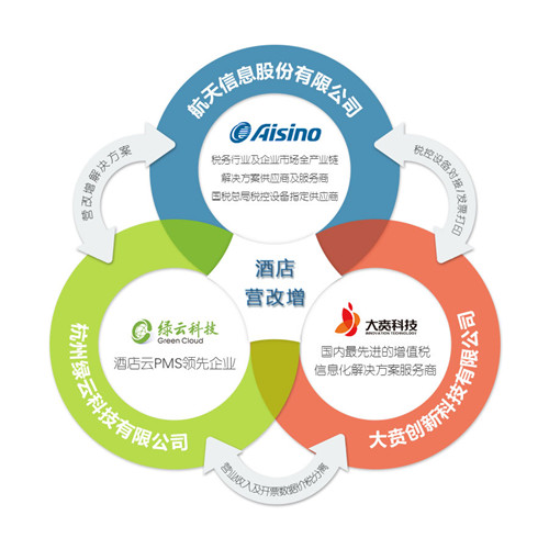 酒店业“营改增”迫在眉睫,绿云作为资深的酒店业技术服务商,一直在积极研发对应的解决方案。近日,绿云与国家大型信息化工程主力军,承担“金税、金卡、金盾”等国家重点工程的航天信息,以及国内增值税解决方案的领先企业大贲科技达成战略合作,三方利用各自专业知识和行业资源,为酒店业提供“嵌入式”的 “营改增”整体解决方案。