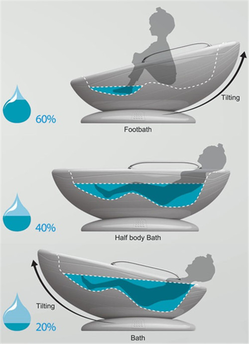 首先,这款浴缸与以往的浴缸完全不同,因为它可以倾斜!(入住者可以通过转动浴缸侧面的倾斜控制钮,实现不同角度的倾斜)