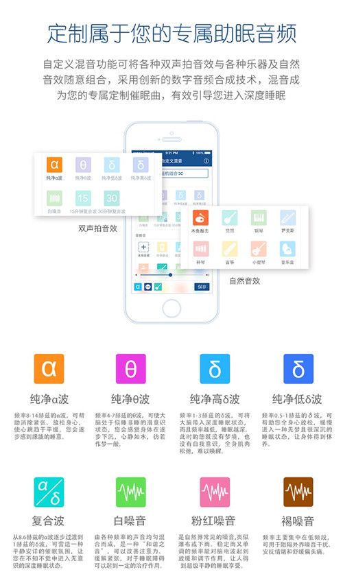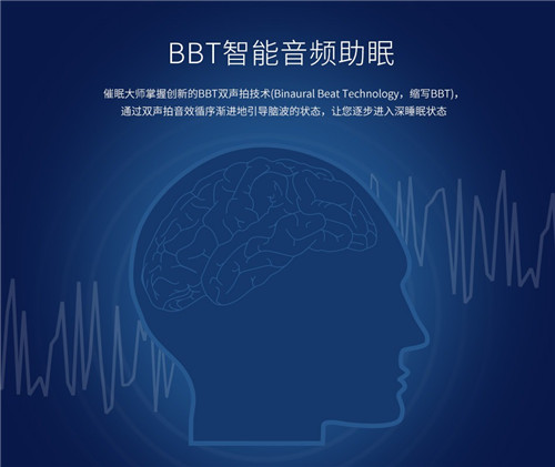 特别需要提一下它的双声拍助眠的功能,因为其工作原理是专门根据人耳接收频率及脑声波接收刺激的频率之间的关联设计的。简单来说,我们的耳朵平时听到的频率是20Hz-20KHz,可是能刺激大脑的声波频率都很低,这时候就需要双声拍技术,即通过对双耳播放不同频率声波,让大脑自动合成第三种声音,从而在这种声音的刺激下,调整脑声波频段,诱导人体进入休眠状态。