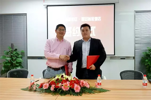 (图为别样红创始人&CEO黄晓凌与尚俭太空舱总经理签约握手)