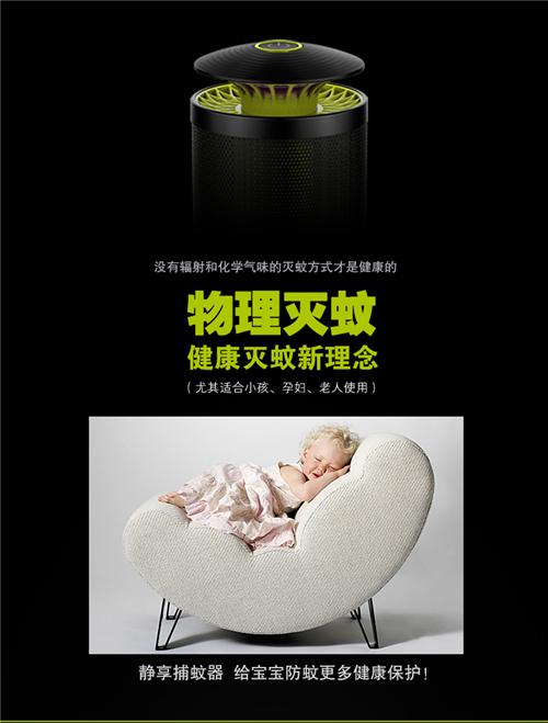 有型有心的静享捕蚊器就这样顺势而生了。它的工作原理,就是通过发出诱蚊光波吸引蚊子,用单向防逃网及涡轮风扇与风道相结合的原理实现静音灭蚊的效果。