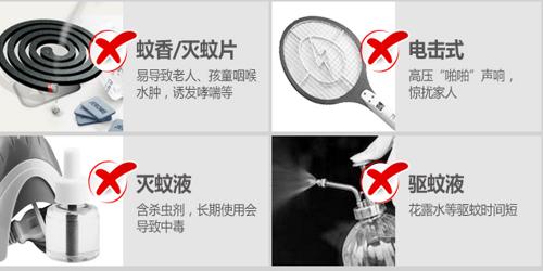 传统方式灭蚊副作用大:花露水效用短,蚊香、灭蚊液有害身体健康,高压灭蚊噪音大。