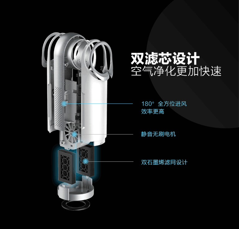设计细节彰显理念,双石墨烯滤芯设计,空气净化更加快速。细看这款石墨烯空气净化器,不仅内在前卫,外部设计无论从出风口、电源孔、进风口等细小处观察,还是整体的穹顶设计、蓝光工作灯都十分优雅科技感。由于体型较小,E200使用方便,随时连接无需安装即插即用,方便快捷。