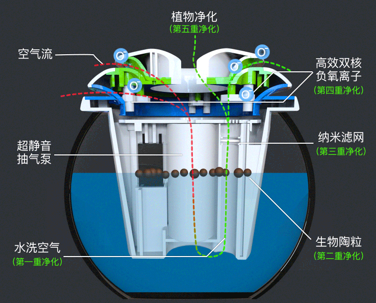 水清新的原理是将含有甲醛、PM2.5、TVOC等的污染空气吸进来水洗空气环节,之后将吸进来的污染物沉淀由植物吸收,变成植物的营养,植物通过光合作用散发氧气。加上机体本身会释放负氧离子,让整个环境的空气像森林一般清新、有机。对比其他空气净化器这款水清新的成本也要低的多,因此它的售价相对较低些。