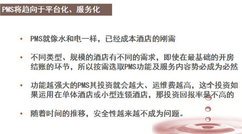 刘宝利:不管是单体酒店还是大型连锁酒店,PMS本身就属于一个工具类产品。任何事物都有两面性,云系统有它的优点,但也存在不足之处。本地系统有些方面它做不到,但是它也有自身的强项。比如我们买一个商品时,在看重其优势时需要忍受一些缺点。所以对于酒店来说,我个人认为云与本地系统来说它只是一个参考维度。酒店应该根据自身的情况,选择适合自己的就好,这应该是一个综合评估的过程。