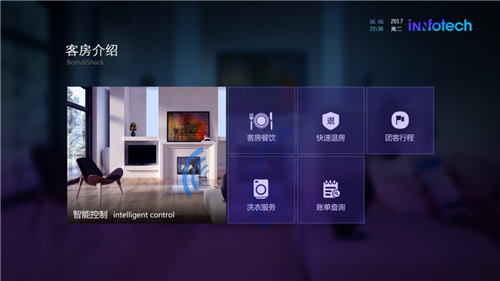 同时,通过与酒店管理系统PMS系统对接,智驿酒店视讯系统集成服务可实现在客房提前预约点餐,退房管理、团客发布信息等功能,让宾客在客房内就可轻松享受贴心到位的酒店服务。