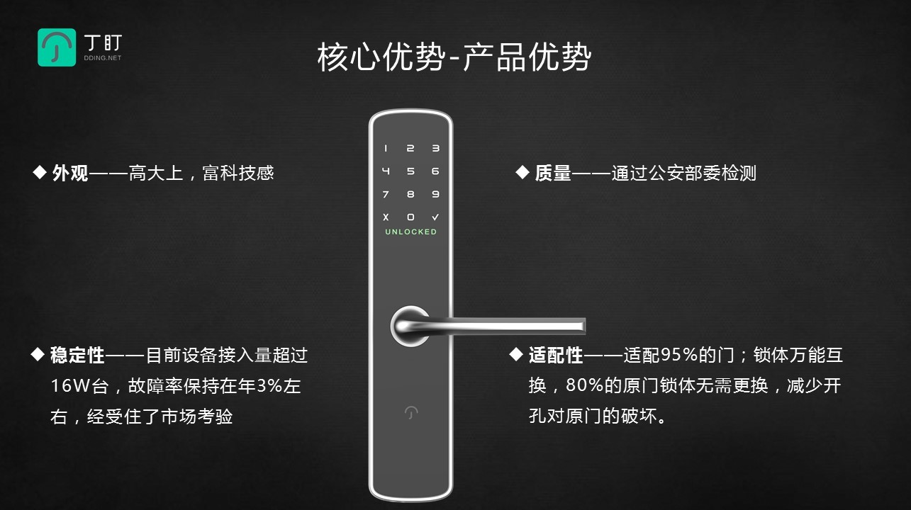 丁盯公寓门锁是一款针对出租公寓的智能门锁,目标在于打造“互联化、安全化、舒适化”的现代智能公寓。智能硬件+SAAA管理平台,打造线下与线上优质品质,团队布局全国,服务内容将以最快的时间完成受理。