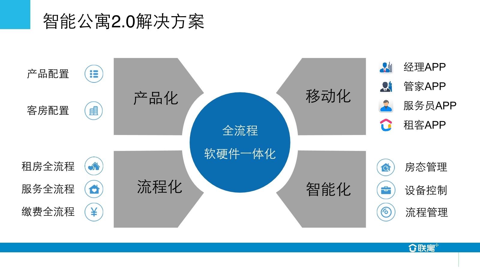 联寓智能公寓2.0促使全部流程软硬件一体化全面提升,推进智能公寓管理,让产品、客房、财务、设备、人员一体化,让公寓管理方更加方便快捷地管理自己旗下的公寓。