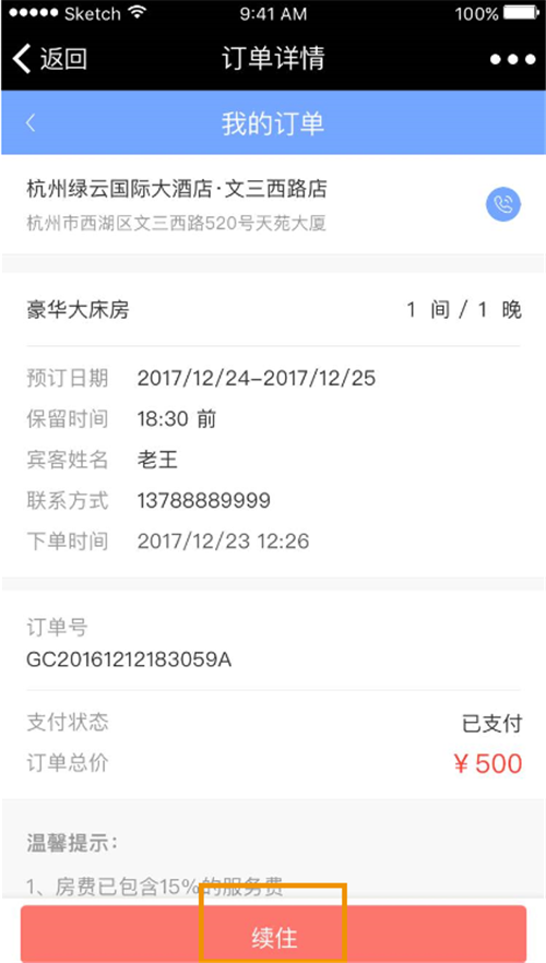 绿云微信平台增加了续住功能,客人在办理续住业务时,无需到酒店前台办理,打开订单详情页选择续住即可轻松完成。对于已结账账单的客人也可以在历史订单中找到续住的选项。