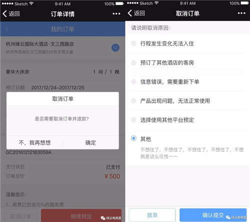 遇上行程改变、信息错误等情况,客人也不必慌张,退款功能已上线。酒店可自行设置是否开启此功能,针对可退款订单,客人可在订单详情页中取消订单并选择退款,酒店审核通过后退款原支付路径返还。