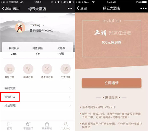 微信营销需要有传播力的内容和分享途径,客人邀请好友注册成为会员即可获得优惠券、积分等优惠,从而有效提升客人忠诚度、增加新粉丝及拓宽会员路径。