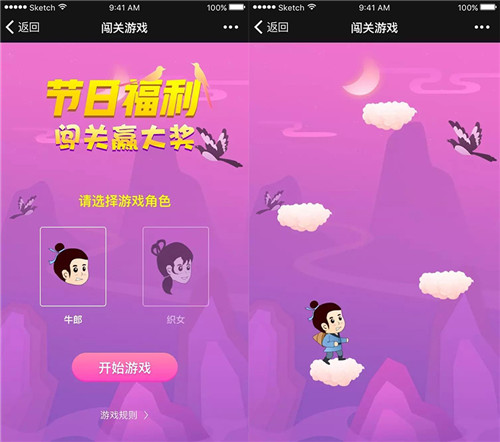 适合节日促销的挑战小游戏。客人左右轻微摇晃手机控制人物左右平移,保持人物向上跳跃,共有三个关卡,通关有惊喜。多主题界面为节日增加欢乐氛围。