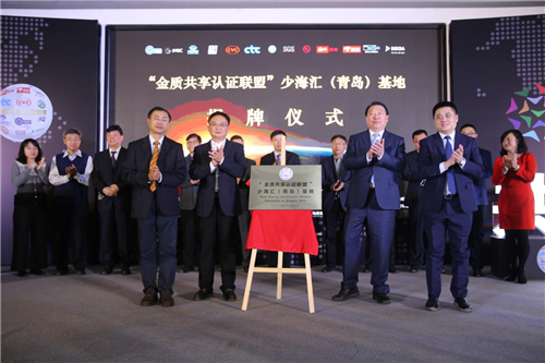 在现场,少海汇携42家企业与中国标准化研究院,成立“金质共享认证联盟”少海汇(青岛)基地,并现场发布了“金质 ”产品评价通则及“金质”标志。