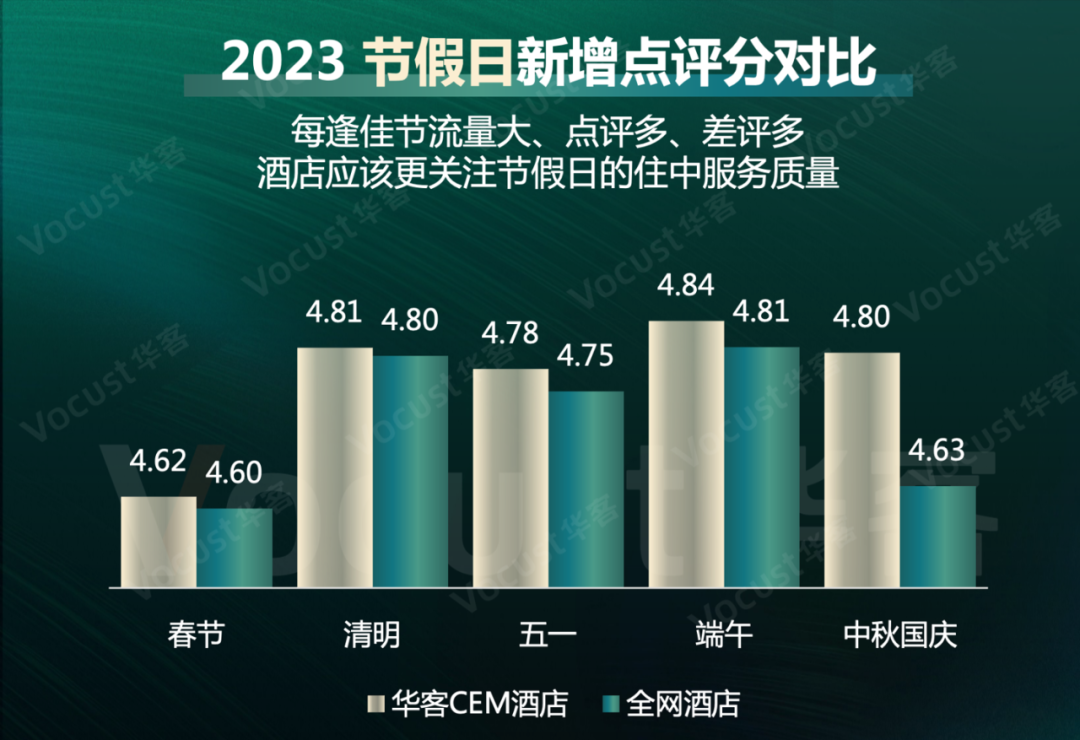 而在流量大、点评多、差评多的节假日,使用了华客CEM体验云系统监控体验GAP和衡量服务修补效果的酒店,其新增点评分均高于未使用系统的酒店。
