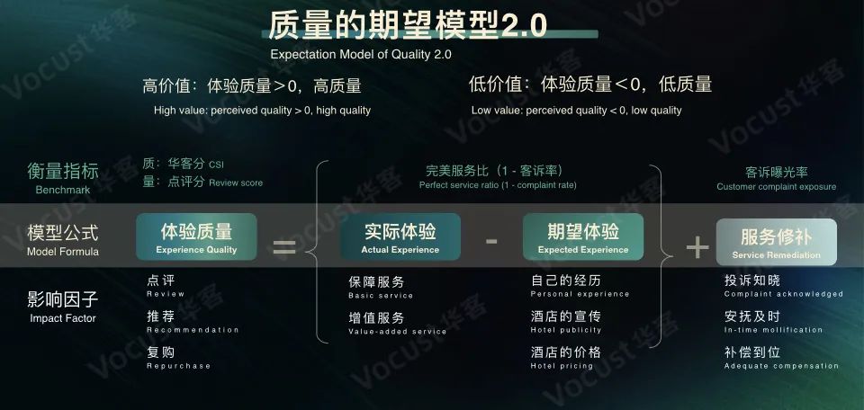 代入「质量的期望模型」,酒店能衡量自身在同类型、同商圈酒店中的体验质量水平,监控实际体验和期望体验是否出现了损耗,定位造成损耗的问题所在,进行修补,再衡量服务修补是否有成效。