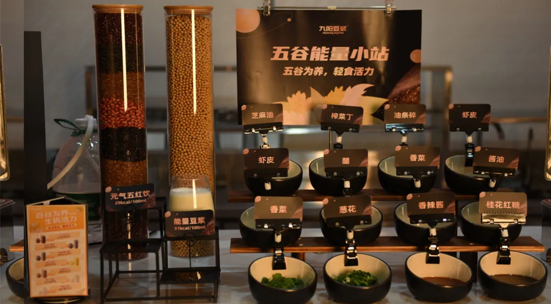 在选品普适性和健康层面,国民饮品豆浆一直备受消费者喜爱,不论是直接饮用,还是佐餐都非常受欢迎。近年来,基于消费需求的转变,九阳豆业在“豆浆+”方面不断探索,推出龙井茉莉豆乳茶、原力米乳、元气五红、醇香黑谷、金瓜玉米等创新饮品和豆花等餐品。